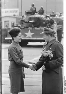 ![]() Американская бронетехника (предположительно слева — БТР М59, справа — танк M48) возле КПП «Чарли» в разгар кризиса, 27 октября 1961 года | |||