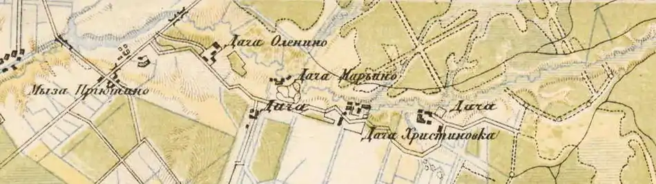 Мыза Приютино, Дача Оленино (Елизаветино), Дача Марьино, Дача (Васильевка), Дача Христиновка, Дача (Софиевка) на карте 1885 г.