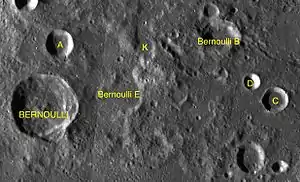 Кратер Бернулли (лат. Bernoulli) — ударный кратер в северо-восточной части видимой стороны Луны. Название дано в честь братьев Бернулли: Якоба Бернулли (1654—1705) — швейцарского математика и Иоганна Бернулли (1667—1748) — швейцарского математика и механика; утверждено Международным астрономическим союзом в 1985 г. Образование кратера относится к позднеимбрийскому периоду[1].