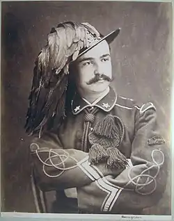 - круглой чёрной шляпы с широкими плоскими краями и большим пуком тёмно-зелёных петушиных перьев, в другом источнике указано что рядовые носят тёмно-синие мундиры с красными петлицами и широкополые войлочные шляпы с султаном.