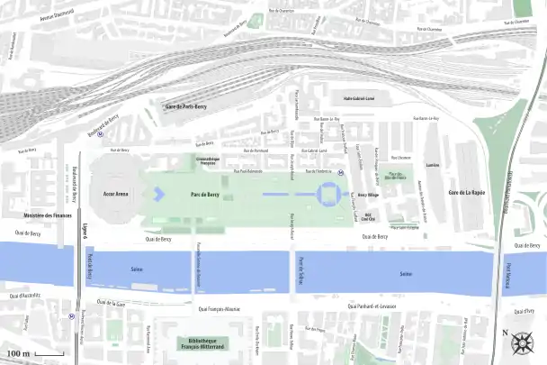 До Берси можно добраться на метро (линии 6 и 14: станции Берси и Кур-Сент-Эмильон). На автомобиле до квартала можно доехать через бульвар Периферик до выезда на трассу A4.