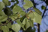 Почки маленькие, узко-яйцевидные, заострённые, уплощённые, отстоящие от ветвей, по краю чешуи клейкие, зелёного цвета, по краям коричневые. Листорасположение — очерёдное. Листья овальные или яйцевидные, длиной 5—12 см, шириной 4—9 см, острые или заостренные, края двоякозубчатые, с округлым, клиновидным или, редко, усечённым основанием, в молодости покрытые волосками, позже голые, тусклотемно-зеленые, на толстых, опушённых черешках длиной 1,5—3 см.