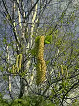 Ствол с отслоившейся корой, листья, мужские (верхнее фото) и женские (нижнее фото) серёжки. |