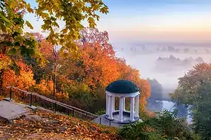 Беседка сооружена в 1-й половине 19 века в стиле классицизма. Кирпичная и оштукатуренная, 8-колонная ротонда, увенчанная антаблементом под полусферическим куполом. Основой 8-колонной ротонды служит разновысокий стилобат, что обусловлено местностью. К беседке, расположенной на одном из уступов склона, ведёт лестница. У лестницы расположен памятный знак — камень с высеченным текстом «Здесь любил отдыхать, любуясь пейзажем, украинский поет-баснописец Л. И. Глебов».
