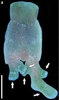 Расположение рта варьируется у разных видов. Он неизменно находится на средней линии тела, на вентральной поверхности, но на этой линии может находиться как у переднего края животного (например, у Hallangia[4]), так и у заднего (например, у Diopisthoporus) или где-либо посередине[29].
