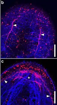 Бескишечные турбеллярии обладают примитивным мозгом, который имеет форму кольца и расположен под эпидермисом в передней части животного. Мозг не отделён от остального тела мембраной, и сквозь него проходят мышечные пучки и протоки фронтальных желёз. От мозга отходят к задней части тела несколько нервных тяжей, расположенных радиально-симметрично. Нервные тяжи соединены с периферийной нервной системой, состоящей из трёх обособленных нервных сетей, которые находятся под слоем мускулатуры (расположенной непосредственно под стенкой тела), между слоем мышц и эпидермисом и в самом эпидермисе соответственно. Такое распределение нервной системы обеспечивает хорошую иннервацию всех слоёв мускулатуры[22]. Нервная система лучше развита на спинной стороне тела червя, чем на брюшной. С помощью методов иммуногистохимии в нервной системе Acoela были найдены серотониноподобные иммунореактивные, RF-амидное семейство пептидов и холинергические части[4][23].