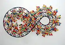 Символ бесконечности впервые появился в опубликованном в 1655 году трактате английского математика Джона Валлиса «О конических сечениях» (лат. De sectionibus conicis, страница 5)[50][51][52]. Предполагается, что символ имеет более древнее происхождение, и связан с уроборосом — змеёй, кусающей свой хвост[53]; подобные символы были найдены среди тибетских наскальных гравюр. В Юникоде бесконечность обозначена символом ∞ (U+221E).