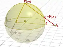 Создавая геометрическую интерпретацию комплексных чисел, Риман в 1851 году воспользовался средствами проективной геометрии, и для комплексной плоскости построил проективное пространство — комплексное обобщение числовой проективной прямой, известное как сфера Римана: полюсы сферы — точки и , а стереографическая проекция (с выколотой точкой ) переводит её в комплексную плоскость. В отличие от вещественного анализа, где используется бесконечность со знаком, в комплексном анализе используется именно проективная форма бесконечности ().