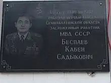 Беспаев Кабен Садыкович - Заслуженный работник МВД, первый генерал Семипалатинской области (ныне Восточно-Казахстанская область) ,за 33 года деятельности в органах внутренних дел Беспаев К.С. внес большой вклад в дело укрепления правопорядка и законности в области. Им подготовлена целая плеяда работников правоохранительных органов. Его многолетний труд отмечен: Орденом Красной Звезды, Орденом Трудового Красного Знамени, медалями Медаль «За победу над Германией в Великой Отечественной войне 1941—1945 гг.», Медаль «За отличную службу по охране общественного порядка», Нагрудный Знак "Заслуженный работник МВД СССР" и многими другими правительственными наградами.
