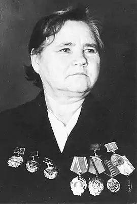 - Также была награждена орденом Трудового Красного Знамени (1975) и медалями, среди которых «За доблестный труд в Великой Отечественной войне 1941—1945 гг.»