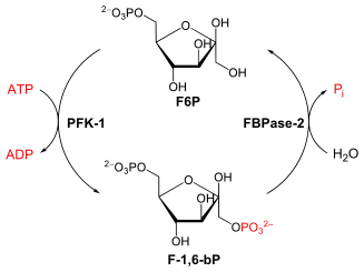 Бесполезный цикл, также известный как цикл субстрата, возникает, когда два метаболических пути одновременно проходят в противоположных направлениях и не имеют общего эффекта, кроме рассеивания энергии в виде тепла[1]. Причина, по которой этот цикл был назван «бесполезным» циклом, заключалась в том, что казалось, что этот цикл работает без чистой пользы для организма. Таким образом, это считалось причудой метаболизма и, таким образом, было названо бесполезным циклом. После дальнейшего исследования было обнаружено, что бесполезные циклы очень важны для регулирования концентраций метаболитов[2]. Например, если бы гликолиз и глюконеогенез были активными одновременно, глюкоза была бы преобразована в пируват путем гликолиза, а затем обратно в глюкозу путем глюконеогенеза с общим потреблением АТФ[3]. Бесполезные циклы могут играть роль в регуляции метаболизма, где бесполезный цикл будет системой, колеблющейся между двумя состояниями и очень чувствительной к небольшим изменениям активности любого из вовлеченных ферментов[4]. Цикл действительно генерирует тепло и может использоваться для поддержания теплового гомеостаза, например, в бурой жировой ткани молодых млекопитающих, или для быстрого генерирования тепла, например, в летательных мышцах насекомых и у животных, находящихся в спячке, во время периодического возбуждения от оцепенения. Сообщалось, что цикл субстрата метаболизма глюкозы — это не бесполезный цикл, а регулирующий процесс. Например, когда внезапно требуется энергия, АТФ заменяется АМФ, гораздо более реактивным аденином.