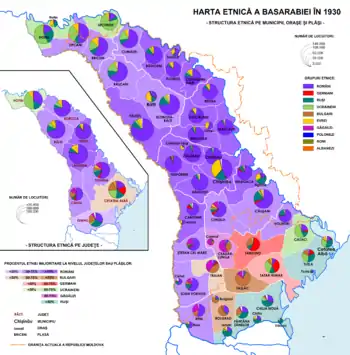 По переписи 1897 года в Бессарабской губернии было 1 933 436 жителей (991 257 мужчин и 942 179 женщин), из них в городах 304 182 (в губернском городе Кишинёве — 108 796). В соответствии с переписью 1897 года «47,6 % жителей Бессарабии были молдаванами, 19,6 — украинцами, 11,8 — евреями, 8 — русскими, 5,3 — болгарами, 3,1 — немцами, 2,9 — гагаузами»[11] Численность молдаван снизилась с 1859 года на 7,3 %.[12]. Города и большинство сёл были многонациональными. Молдаване, болгары, гагаузы, немцы жили, в основном, в сёлах. 37,2 % горожан составляли евреи, 24,4 — русские, 15,8 — украинцы, 14,2 — молдаване[11]. По мнению некоторых учёных Молдавской ССР, численность русских в Бессарабии была завышена и составляла меньше чем 8,1 % (155,7 тыс.), так как к русским были причислены и часть украинцев и белорусов. По расчётам В. Зеленчука, численность русских равнялась 123,1 тыс. человек.[13] И. В. Табак приводит цифру в 100 тыс. человек.[14] Перепись 1897 года также свидетельствует, что русские играли заметную роль в сферах, связанных с деятельностью государственной администрации, суда, полиции, юридической, общественной и сословной службы, где они составляли более 60 %.[15]