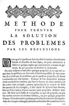 Популярным сочинением Френикля был и «Метод решения проблем исключением». Книга была издана посмертно в 1693 году и впоследствии переиздавалась. Однако эта книга скорее была учебником для молодых математиков, интересующихся теорией чисел, и не содержала важных новых математических результатов. В противоположность аксиоматической методологии Евклида от общего к частному метод Френикля идёт от частного к общему. Френикль отталкивался от примеров и подчёркивал, что не использует иных доказательств помимо конструктивного построения[6].