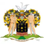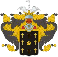 Описание герба: Выдержка из Общего гербовника В щите, имеющем чёрное поле, изображены восемь золотых крестов, положенных числом три, два, три и имеющих на трёх верхних концах крестообразыне перекладины, а между ними, на середине щита, пятилиственный золотой цветок. Щит увенчан дворянским шлемом и короной, на поверхности которой виден выходящий страус с распростёртыми крыльями. Намёт на щите чёрный, подложенный золотом.[1] |