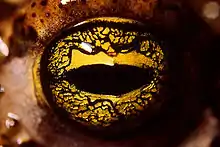 Глаза бесхвостых расположены в верхней части головы и часто выдвинуты вперёд. Это обеспечивает бесхвостым широкое поле зрения; лягушка может полностью погрузиться в воду, оставив над поверхностью лишь глаза. Глаза защищены подвижными веками и дополнительно прозрачной неподвижной мембраной, предохраняющей глаза во время пребывания в воде. Цвет радужной оболочки и форма зрачка у разных видов отличаются[53].