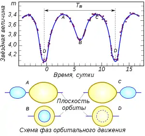 Изменение блеска в фазах между минимумами блеска происходит медленно. Это объясняется тем, что звёзды в паре вытянуты вдоль их соединяющей оси из-за приливных сил, поэтому площадь излучающей поверхности по направлению луча зрения изменяется.