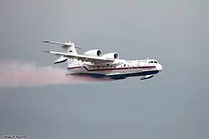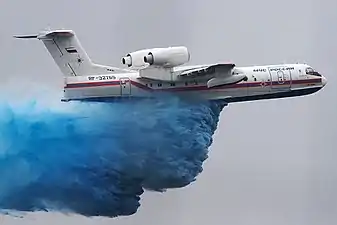 ![]() Бе-200ЧС выливает воду, окрашенную в цвета российского флага, на МАКС-2009 | |