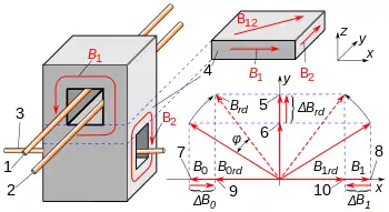Запись информации производится подачей импульса тока прямого или обратного направления в провод записи (1, см. рисунок), амплитуда тока записи достаточна для намагничивания до насыщения кольцевого магнитопровода охватывающего верхнее по рисунку отверстие. Направление тока записи определяет записанный бит — 0 или 1. Допустим, была произведена запись 0, при этом остаточный магнитный поток охватывающий верхнее отверстие в магнитопроводе направлен против часовой стрелки. Стенки, окружающие нижнее отверстие, исходно тоже намагничены до насыщения с индукцией Магнитные потоки охватывающие отверстия суммируются в перемычке между отверстиями (4) и суммарная индукция в этой перемычке будет при отсутствии токов в обмотках равна При считывании в обмотку опроса (3) подаётся импульс тока, стремящийся намагнитить магнитопровод, охватывающий нижнее отверстие, в направлении остаточной индукции, то есть при считывании полярность импульсов тока всегда одинаковая. Подача импульса опроса увеличивает исходную индукцию (6) вокруг нижнего отверстия на величину (5). Так как перемычка в отсутствии токов намагничена до насыщения, то подача импульса опроса не может изменить модуль индукции в перемычке и изменяет лишь его направление на угол Этот поворот вектора индукции изменяет модуль индукции потока верхнего отверстия и он изменяется от значения (7) до величины (9), таким образом индукция магнитного потока, охватывающего верхнее отверстие, изменяется на величину . Это изменение потока наводит импульс ЭДС в обмотке считывания (2).