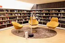 Внутренние стены библиотеки сделаны из бетона и досок, окрашены или покрыты лаком. В них проделаны прямоугольные и круглые отверстия в виде иллюминаторов. Преобладающие цвета — лимонно-жёлтый и фиолетово-синий[2].