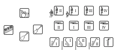 Каждая секция духовых состоит из 4 или 5 инструментов, входящих в группу. Например, у саксофонов: 1, 2 — альт-саксофон, 1, 2 — тенор-саксофон, 1 — баритон-саксофон; у труб — 1, 2, 3, 4, (5) — трубы (иногда заменяется на флюгельгорн); у тромбонов — 1, 2, 3, 4 — тромбоны или бас-тромбоны. При этом первые номера всегда являются ведущими. При исполнении тутти ведущей является первая труба.