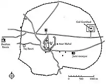 Столице султаната была присуща разнообразная архитектура. Для защиты от нападений город Биджапур был обнесен крепостной стеной высотой 9 метров и толщиной от 9 до 10 метров, в центре города находилась цитадель, защищенная двумя рядами стен. Другим инженерно-архитектурным достижением была система городского водоснабжения. В Биджапуре были построены подземные трубы, через которые вода из внешних источников и резервуаров попадала в открытые городские цистерны, а оттуда распределялась по всему городу. Поступление воды регулировалось высокими каменными водонапорными башнями, установленными вдоль водопроводной сети. Эта же вода поступала в декоративные бассейны и фонтаны, построенные в городских садах и парках.