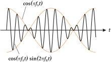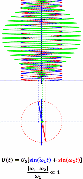 Это низкочастотное колебание является огибающей высокочастотного колебания. Поскольку модуль огибающей меняется от нуля до максимума дважды за период, частота биений равна удвоенной частоте огибающей то есть разности частот исходных сигналов.