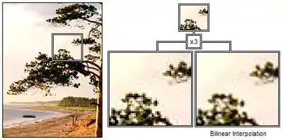 Билинейная интерполяция — один из методов интерполяции и используется для вычисления цветов дополнительных пикселей () относительно основных, исходных, заданных в оригинальном изображении с известными цветовыми координатами , причем цветовые координаты пикселей, лежащих внутри прямоугольника с заданными цветовыми координатами в вершинах его, или одна цветовая координата в случае полутоновых изображений, вычисляются во всех точках между опорными точками, что позволяет сглаживать резкие границы между пикселями исходного изображения. Значения функций в данном случае вычисляется по цветовым координатам опорных точек. При этом сторона квадрата, образованного четырьмя смежными рассматриваемыми основными точками обычно принимается за единицу.