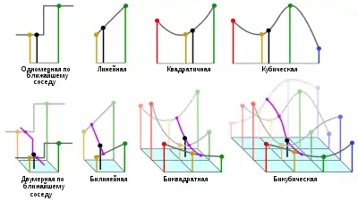 Изображены одномерная и двумерная интерполяции к ближайшему соседу, линейная, квадратическая, кубическая билинейная, биквадратная и бикубическая интерполяции.