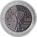 | Реверс: космонавт на фоне стилизованного изображения Солнечной системы и звёзд, надписи на рус. КОСМОС, каз. ҒАРЫШ и англ. SPACE, год выпуска монеты. Материал: серебро-925 (кольцо, 14,6 г), тантал (центр, 26,8 г). Диаметр: 38,61 мм[5]. Тираж: 4000 шт.[6] | ||