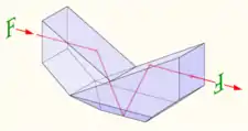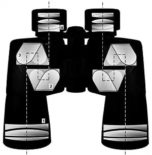 В призматических биноклях для повторного переворачивания изображения (а заодно для укорачивания бинокля) используются призмы. На практике применяются призмы Порро, Аббе и Шмидта — Пехана. Последние два типа призм известны как «roof» («крышеобразные»).
