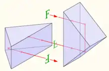 Призмы Аббе названы по имени изобретателя Эрнста Аббе, сотрудника фирмы «Карл Цейс». Существуют три типа призм Аббе: одна дисперсионная[4] и два типа оборачивающих призм Аббе: тип 1 (призма Аббе — Кёнига) и тип 2. В современных биноклях с прямыми трубами используется призма Аббе — Кёнига, запатентованная в 1905 году. Центральный луч в каждой трубе несколько раз меняет направление, но в конце возвращается на первоначальную прямую. Расстояние между центрами объективов равно расстоянию между центрами окуляров (то есть расстоянию между зрачками). Поэтому невозможно применение объективов диаметром больше 65 мм. Недостатками призм Аббе — Кёнига считались также потери света на некоторых отражающих поверхностях и на поверхностях склейки. Но в дорогих биноклях специальные технологии сильно уменьшают потери. Кроме того, в призмах Аббе — Кёнига существует фазовый сдвиг между лучами света, проходящими через разные части призмы, что уменьшает яркость и контрастность изображения. Однако, в дорогих биноклях имеется фазокорректирующее покрытие, устраняющее этот недостаток. Преимуществом призм Аббе — Кёнига является компактность бинокля. Также для таких призм проще сконструировать герметичный прибор.