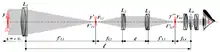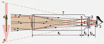 В апризматических биноклях между объективом и окуляром помещается оборачивающая система из одной или двух линз, повторно переворачивающая изображение. Центральный луч в каждой трубе идёт по прямой линии, без излома. Расстояние между центрами объективов равно расстоянию между центрами окуляров (то есть расстоянию между зрачками). Поэтому невозможно применение объективов диаметром больше 65 мм. Но главным недостатком таких биноклей является большая длина.
