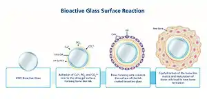 Изменяя состав биоматериала, можно в широких пределах менять биоактивность и резорбируемость биостекла. Если материал биоактивный — образуется костная ткань, если биорезорбируемый — происходит замена материала костной тканью[24].