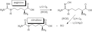 Синтаза оксида азота окисляет гуанидиновую группу L-аргинина в ходе процесса, который приводит к расходованию пяти электронов и образованию оксида азота (II) и эквимолярных количеств L-цитруллина. Этот процесс включает окисление НАДФ-H+ и восстановление молекулярного кислорода. Это превращение происходит в каталитическом сайте фермента, расположенном вблизи специфического участка связывания L-аргинина.[1]