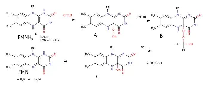 Дальнейшим шагом стали работы Мак Элроя и Грина (1955 г.), продемонстрировавших, что для реакции люминесценции, катализируемой бактериальным люциферазным комплексом, кроме NADH, алифатического альдегида и кислорода, необходимо и производное рибофлавина — флавинмононуклеотид, являющийся коферментом многих оксидоредуктаз и встречающийся во всех живых организмах. Сопряжённое окисление восстановленого флавинмононуклеотида и альдегида приводит к образованию возбуждённого флавинового фрагмента, испускающего голубой свет с λmax 490 нм: