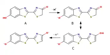 Оксилюциферин светляков способен к кето-енольной таутомерии и в растворах существует в виде смеси кетонной и енольной форм. Отношение количеств кето- и енольного таутомеров зависит от pH среды: в слабощелочных условиях (pH 7.5 — 7.8 и выше) преобладает енольная форма, при этом максимум в спектре биолюминесценции приходится на 587 нм, то есть на жёлто-зелёную область, при закислении среды (pH < 6) преобладающей становится кетонная форма и максимум в спектре излучения сдвигается в длинноволновую область до 618 нм, то есть в красную область. При подщелачивании среды образуется енолят-анион оксилюциферина, и максимум в спектре смещается в коротковолновую область до 556 нм. При промежуточных значениях pH в растворе присутствует смесь обеих форм и спектр излучения оказывается бимодальным, воспринимаемый глазом промежуточный оттенок получается вследствие аддитивного смещения жёлто-зелёного и красного света[8].