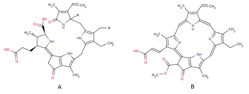 Структура этих люциферинов (A) содержит четыре пиррольных ядра и очень близка к структуре хлорофилла C1 (B), однако, в отличие от хлорофиллов тетрапиррольные люциферины незамкнуты; люциферин эфваузид представляет собой гидроксипроизводное люциферина динофлагеллят[12].