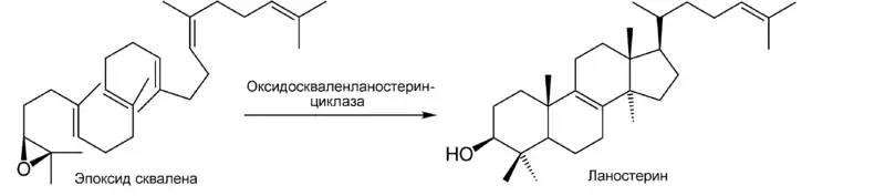 - 2. Затем эпоксид сквалена циклизуется в ланостерин. При этом метильная группа у С14 переносится на С13, а метильная группа у С8 — на С14.
