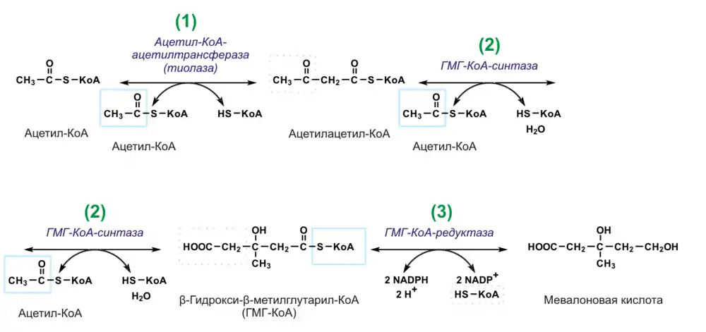 - Образование мевалоната восстановлением ГМГ и отщеплением HS-KoA с помощью НАДФ-зависимой гидроксиметилглутарил-КоА-редуктазы (ГМГ-КоА-редуктаза). Происходит в гЭПР. Это первая практически необратимая реакция в цепи биосинтеза холестерина, а также она лимитирует скорость биосинтеза холестерина. Отмечены суточные колебания синтеза этого фермента. Активность его увеличивается при введении инсулина и тиреоидных гормонов, снижается при голодании, введении глюкагона, глюкокортикоидов.