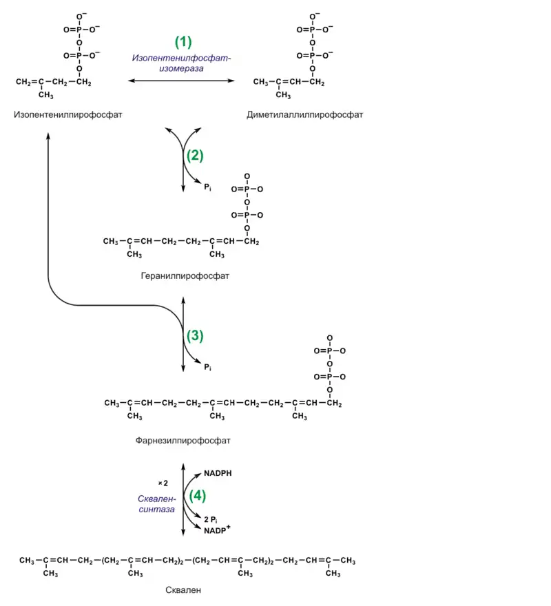 - Образование тридцатиуглеродного изопреноида сквалена из шести молекул изопентенилдифосфата.