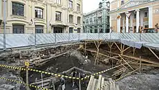 В июне того же года на площади приступили к раскопкам для установки фонтана. В ходе работ были найдены остатки Ильинского крестца — кладка церкви Благовещения Пресвятой Богородицы на подворье Иосифо-Волоцкого монастыря. Археологи предположили, что дальше по улице можно найти стены Троицкого подворья[10]. Также в процессе работ обнаружили около 500 предметов быта, среди которых византийские браслеты, кожаные ножны, обувь, монеты времён Ивана Грозного и импортный сосуд с надписью на персидском языке. Учёные-востоковеды установили, что надпись — это стихи персидского поэта XIV века Хафиза Ширази. Кроме того, была найдена лестница, которая вела в храмовую кладовую на территории подворья Иосифо-Волоцкого монастыря[11][12][13].
