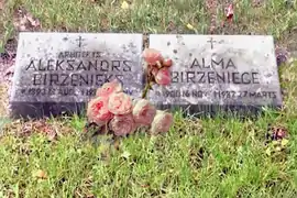 - Братское кладбище. Рига. Александр Бирзениекс, Альма Бирзениеце. (недоступная ссылка). Дата обращения: 16 января 2020. Архивировано 24 марта 2019 года.