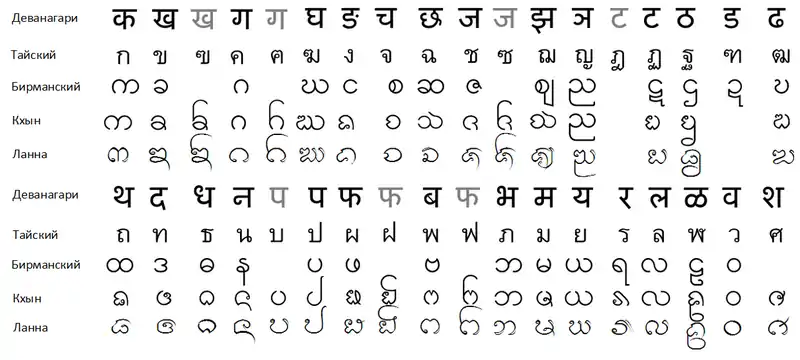 Сравнительная таблица письменностей деванагари, бирманской, туа-тхам и ланна.