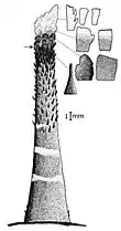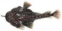 Относится к группе видов «P. mentella». От прочих видов группы отличается следующим комплексом признаков. Подбородочный усик короткий (10—12 % стандартной длины рыбы), при отгибании его назад поверх рыла (при закрытом рте) слегка заходит за передний край орбиты. Усик имеет коричневую или коричнево-пятнистую окраску дорсальной стороны стебля и беловатое терминальное расширение. Терминальное расширение короткое, составляет менее трети длины усика (18—29 % длины усика), практически не выраженное в толщину, сужающееся к кончику. Дистальная часть стебля усика покрыта черноватыми мелкими пальцеобразными, сужающимися к концам отростками. Терминальное расширение образовано одиночными листовидными отростками и продольными складками, несущими на гребне пильчатые листовидные отростки. Нижняя челюсть слабо выдается вперед: при закрытом рте на её вершине зубы не видны. Спинной плавник очень низкий (около 18 % стандартной длины у самцов); передняя лопасть плавника у самцов отсутствует; все лучи плавника прямые (не извилистые), с точкой первичного ветвления, расположенной примерно на уровне верхней трети-четверти их длины. Общая окраска плавника зеленоватая, пестрая, с нечеткими темными косыми полосами. Грудные плавники зеленоватые, с чередующимися темными и бирюзовыми вертикальными полосами, светлеющие к краям. Хвостовой плавник зеленоватый, с темными вертикальными полосами. Верх головы и передняя часть спины перед первым спинным плавником покрыты округлыми и неправильными темно-коричневыми пятнами; нижняя поверхность головы, грудь и живот без четко выраженных пятен. Нижнечелюстная дыхательная перепонка темная в передней части, светлеющая кзади[1].