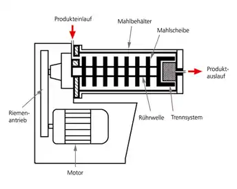 Бисерная мельница представляет собой цилиндрический сосуд с мешалкой или перемешивающим ротором, имеющим ряд вспомогательных функций и обеспечивающим различные режимы перемешивания и циркуляции бисера. Мельница заполнена бисером на 70-80 % объёма. При размоле в камеру заливают суспензию размалываемого порошка, которая заполняет весь свободный объём. При вращении ротора мельницы происходит движение бисера, который перетирает частицы материала. По окончании работы суспензию материала сливают из мельницы. Промышленная бисерная мельница работает в непрерывном или циркуляционном режимах, то есть перемалывает прокачиваемую суспензию. Все современные мельницы могут работать в таком режиме и имеют ситовый патрон или щель для отделения бисера от суспензии.