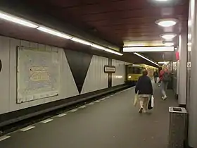 Колонная двухпролетная станция мелкого заложения. Архитектор — Райнер Г. Рюммлер. Длина платформы — 110 метров, ширина — 11,6 метров. Путевые стены отделаны белыми и черными металлическими панелями. Название станции написано красными буквами, что сочетается с красным потолком станции. Колонны отделаны серебристыми металлическими панелями.