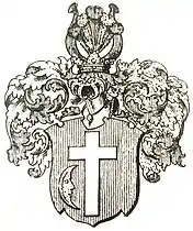 Описание герба: В червлёном поле серебряный латинский крест, в нижнем левом углу сопровождаемый обращённым рогами к правой стороне щита золотым полумесяцем. Намёт червлёный, подложенный серебром. В нашлемнике пять страусовых перьев. |