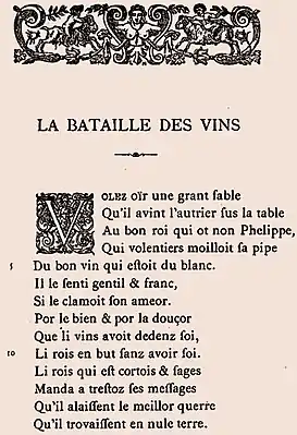 Поэма состоит из 204 стихов и рассказывает о турнире по дегустации вин, который был устроен королём Филиппом Августом[1]. Он послал гонцов собрать везде лучшие вина, которые поэт подробно перечисляет в своей поэме. В более ранней из двух версий поэмы из 70 перечисленных вин (все – французские) поименно лишь два сорта происходили из региона Бордо, шесть из Анжу-Пуату, два из Бургундии, четыре из Лангедока. В более поздней версии присутствует вина, изготовленные за пределами Франции (Мозель, Кипр, Испания). Все вина были белыми.