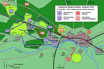 Уркварт решил в первый день операции отправить 1-ю парашютную бригаду под командованием Джеральда Латбери и 1-ю воздушно-десантную бригаду под командованием Филиппа Хикса[12]. Бригада Хикса с артиллерией, инженерным и медицинским корпусами должна была приземлиться в зонах посадки «S» и «Z» и обеспечить безопасность остальных посадочных зон. Три батальона парашютной бригады Латбери должны были приземлиться в зоне выброски «X» и тремя отдельными группами захватить мосты[13]. 2-й парашютный батальон под командованием подполковника Джона Фроста должен был проследовать вдоль реки к центру Арнема и захватить автомобильный и железнодорожный мосты, а также понтонный мост между ними. 3-й парашютный батальон подполковника Фитча должен был пройти в Арнем через Остербек, помочь в захвате автомобильного моста и занять позиции на востоке города[13]. 1-й парашютный батальон подполковника Доби должен был проследовать к северу от железнодорожной линии, чтобы занять высоту на севере и северо-западе от Арнема[13]