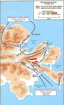 11 мая разведывательная группа высадилась с подводных лодок в девяти милях к северо-западу от основного расположения японских сил и, не встретив сопротивления, стала продвигаться вглубь острова. Основные же силы произвели высадку на юго-востоке острова. К вечеру 11 мая количество американских войск на острове достигло 3500 человек. При поддержке с моря и с воздуха они принялись продвигаться по направлению к основной базе японских войск на северо-востоке острова.